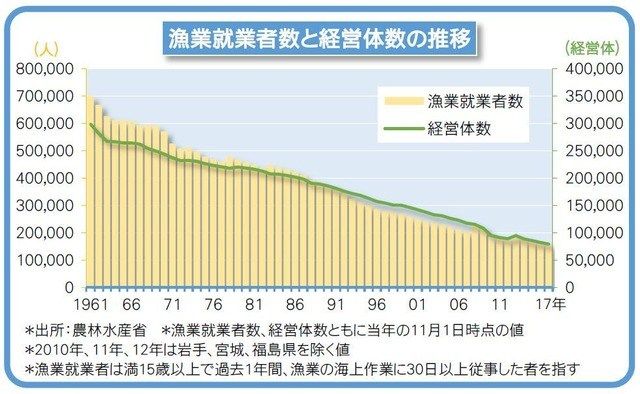漁業者の減少が止まらない。農林水産省が28日発表した「平成29年漁業就業動向調査」によると、2017年11月1日時点の漁業就業者数は前年同期比4%減の15万3490人。統計が始まった56年前の70万人から減少が続く。なぜ減少に歯止めがかからないのか。